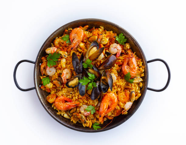 Deliciosa paella de mariscos con arroz, Langostinos, camarones, calamar, mejillones y sofrito, acompañado de 2 botellas de vino.
